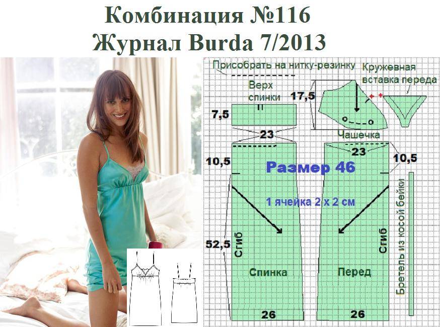 В предыдущих пунктах мы изучали технологию, которая больше подходит новичкам. Но если читатель хочет работать, как профессиональные раскройщицы и швея следует действовать иначе. Для читателей, которые предпочитают конкретику, мы подготовили выкройку платья комбинации из “Бурда” – любимого журнала всех рукодельниц.