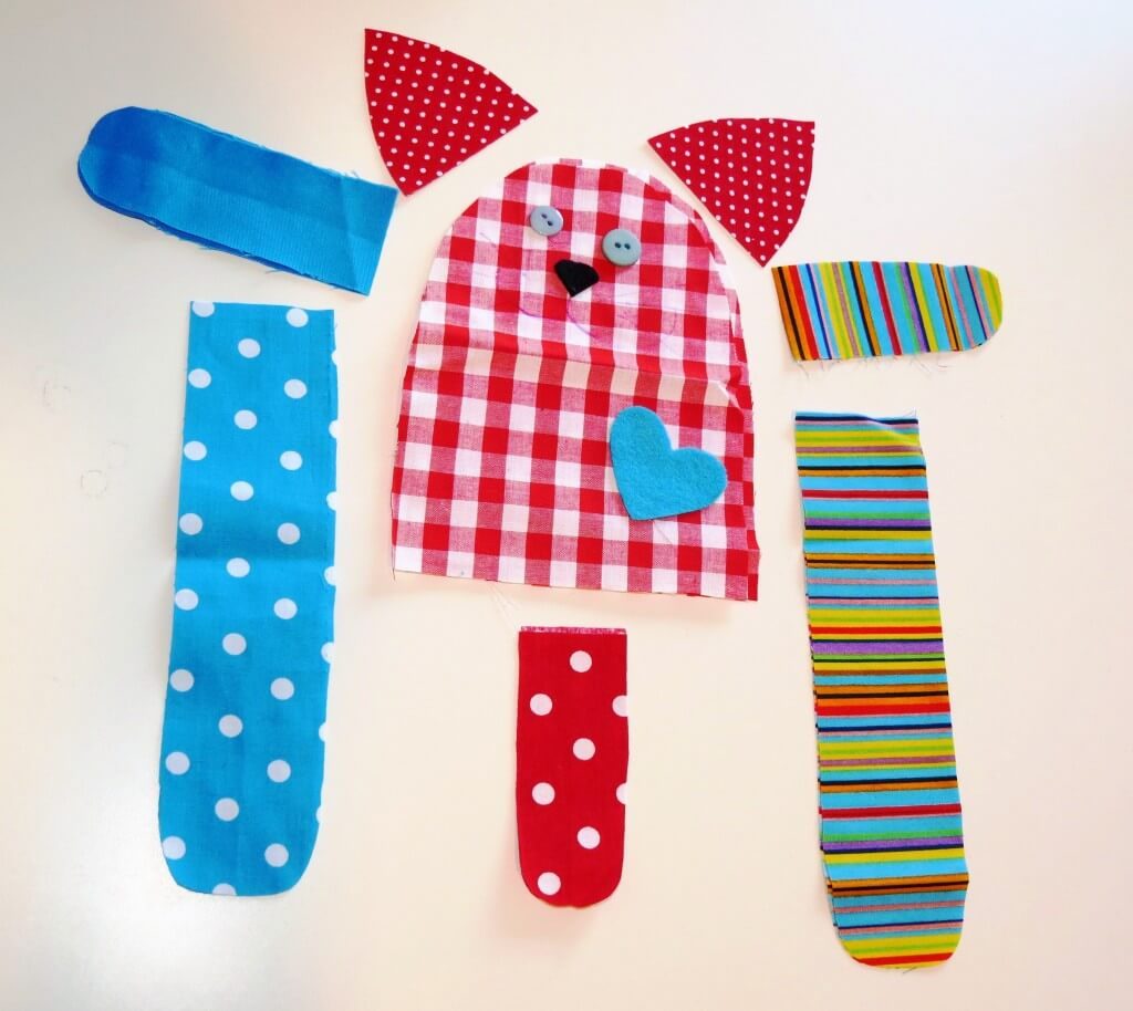 Складываем длинные детали лицевая к лицевой. Сшивают все детали лапок и хвоста, отступив от края 0,7-1 см. Одну сторону всех деталей оставить не прошитой – через отверстие мы будем набивать игрушку наполнителем.