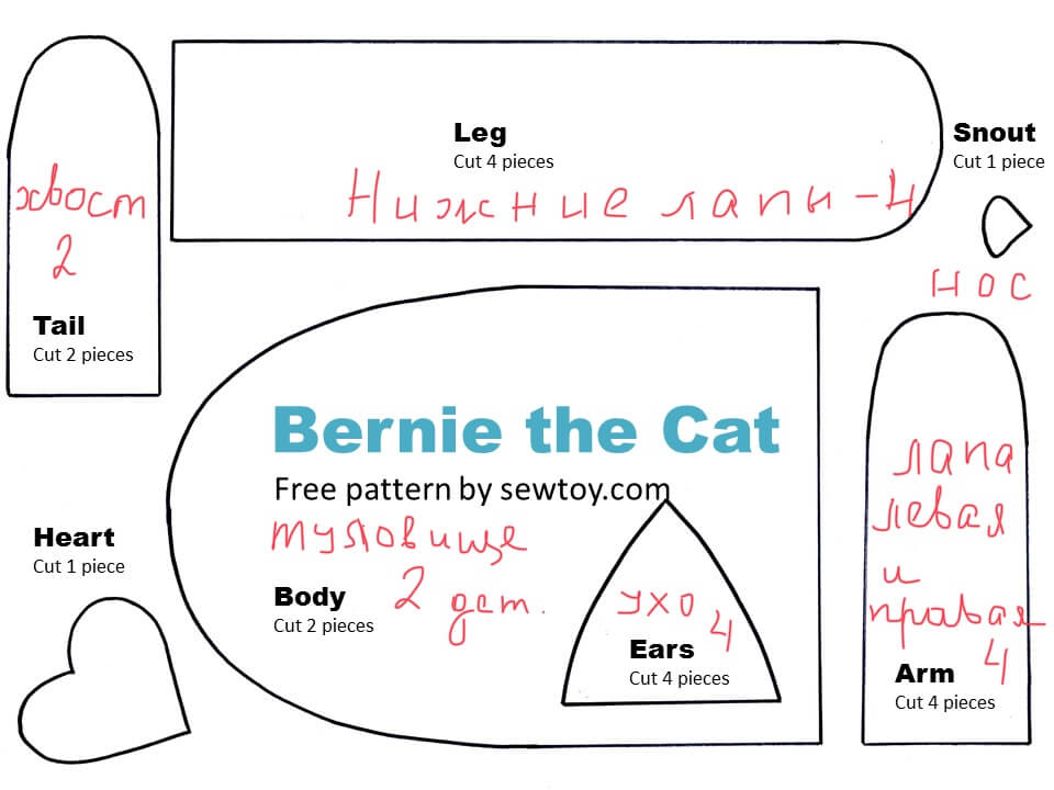 Фото 1. Выкройки для игрушечного котёнка своими руками, с учётом разметки всех припусков и указанием количества необходимых деталей.