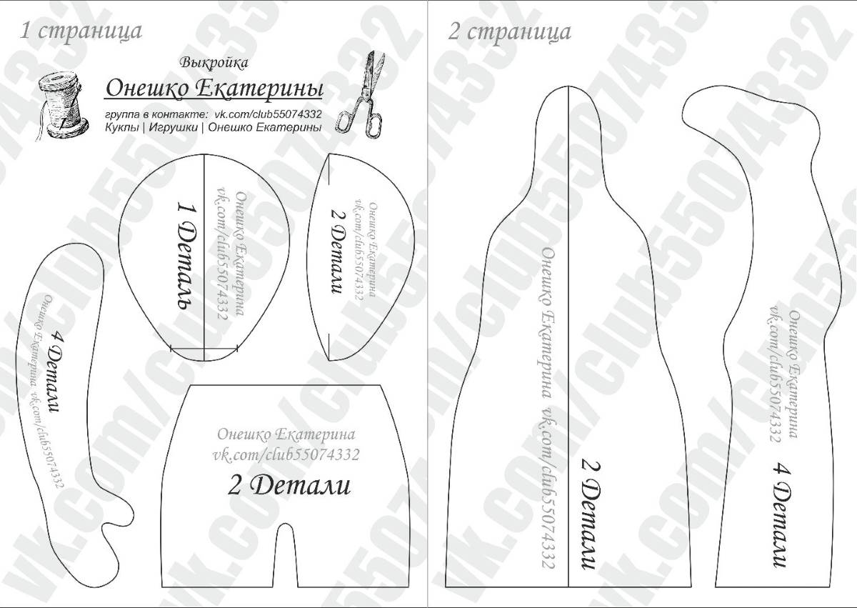 Выкройки можно найти в интернете и распечатать. Можно самим сделать натуральной величины выкройки нужного вам размера. Комплект состоит из выкроек туловища с головой, выкройки ручек и ножек.