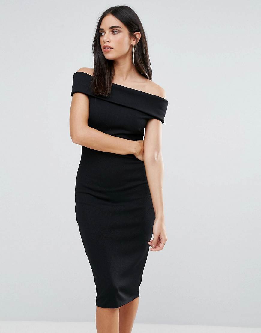 Такой наряд смотрится очень стильно и элегантно. Чтобы создать максимально эффектный лук с участием черного платья, его стоит дополнить элегантной накидкой контрастного цвета. К ней следует подобрать туфли и клатч.