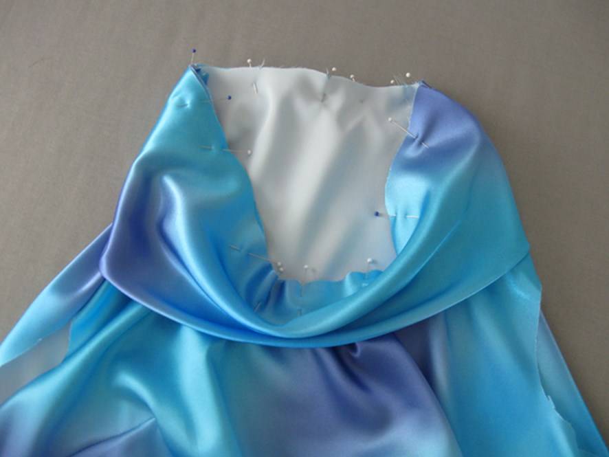 - Пришить обтачку к верхнему срезу платья. Это полоска ткани по длине верхней границы лифа и шириной «под резинку» плюс 2 см, чтобы сшить полоску обтачки в кольцо.Вопрос: «как Вы соединяете стык обтачек в кольцо? заранее? или когда непосредственно пришиваете?» — Ответ: » Я вначале прикалываю обтачку лицо + лицо к вырезу, чтобы точно определить место стыковочного шва. Соединяю строчкой короткие стороны полоски, затем притачиваю единым швом закольцованную таким образом обтачку. »