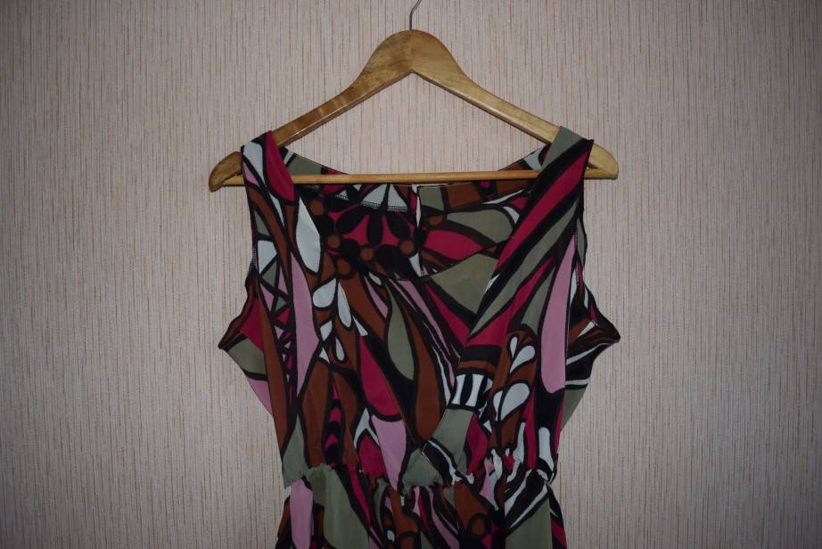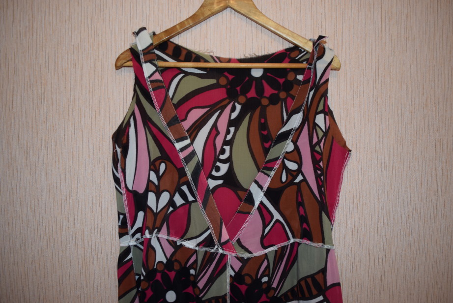После обработки талиевого среза примеряем заготовку комбинезончика на себе. Обязательно проверьте, как он будет сидеть по груди, поскольку такой глубокий вырез красиво сядет далеко не на каждую грудь. Мы решили немного подкорректировать глубину с помощью треугольной тканевой вставки, а на спинке добавить разрез, чтобы изделие было удобнее одевать.