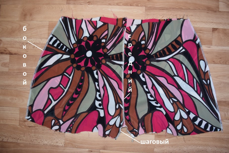 Сшиваем передние и задние половины шортиков по центральному срезу.