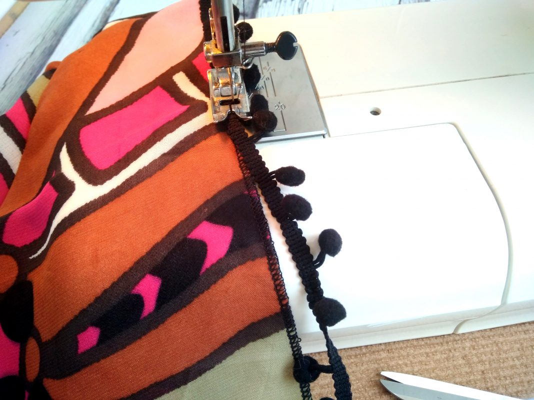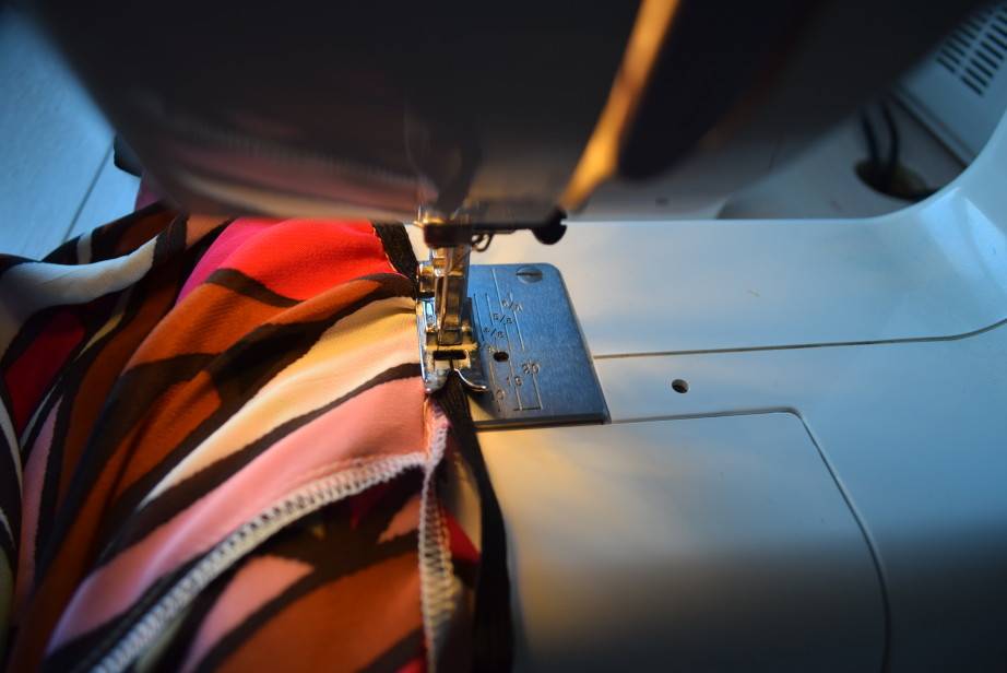 Настрачиваем резиночку на припуски для швов на уровне талии. Распределяем её натяжение таким образом, чтобы оно равномерно легло по всему периметру. Используем шов «зигзаг».