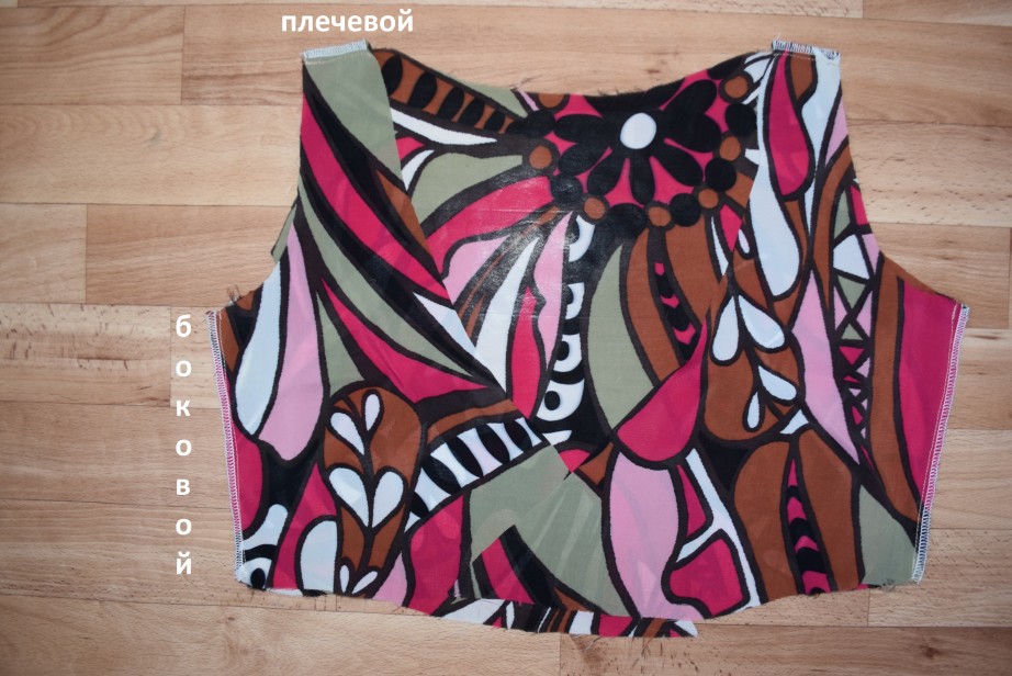 Вооружаемся выкройками полочки и спинки. Вначале соединяем верх изделия по плечам, далее – по боковым срезам.