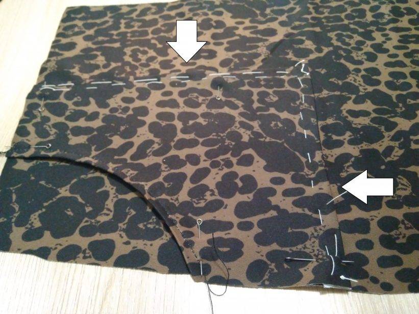 - Потребуются две вытачки — одна будет расположена под углом и направлена вверх и наружу, другая прокладывается в горизонтальном направлении. На рисунке они обозначены под номерами 1 и 2.