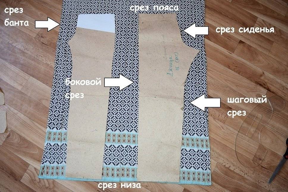 - Предварительно нужно определиться с правильным положением лекал. Направление основных нитей должно располагаться по направлению к низу штанин.