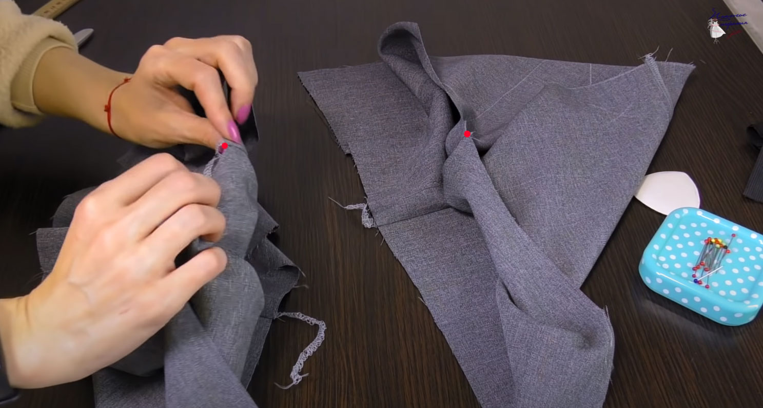 - Соедините половины. Положите одну половину на другую лицевой стороной внутрь и аккуратно совместите края. Закрепите швы при помощи штифтов или швейных булавок, чтобы держать ткань на месте перед шитьем.