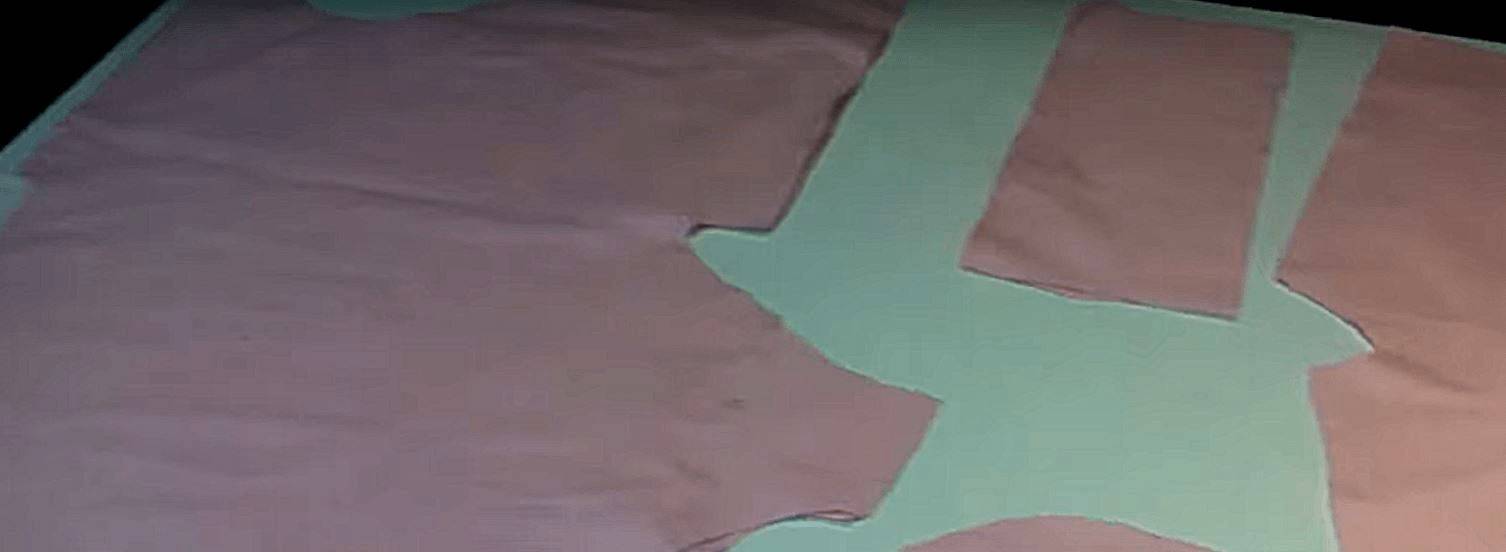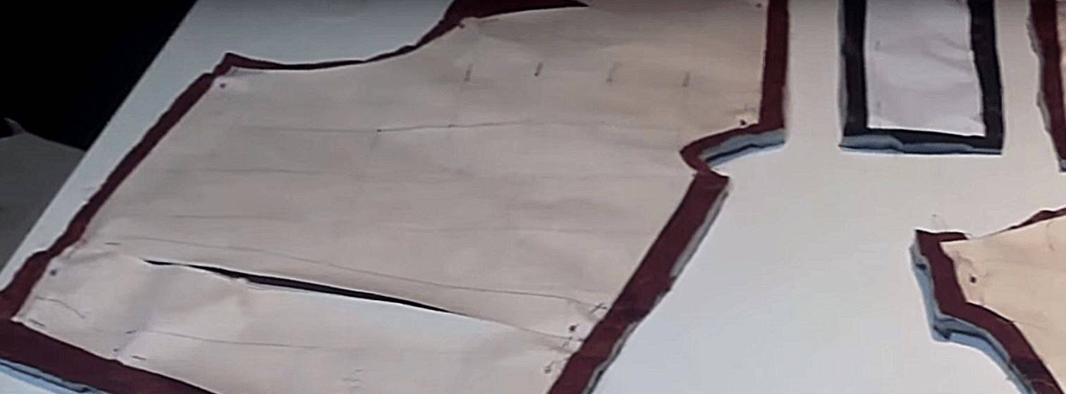 Нижнюю вставку прикладываем пунктирной линией вдоль сгиба. Шаблоны пришпиливаются либо приметываются. Закрепленную выкройку очерчиваем мелом с учетом небольших припусков (0,5см — 1 см) на швы. Когда выкройка перенесена на ткань, оцениваем визуально и вырезаем.