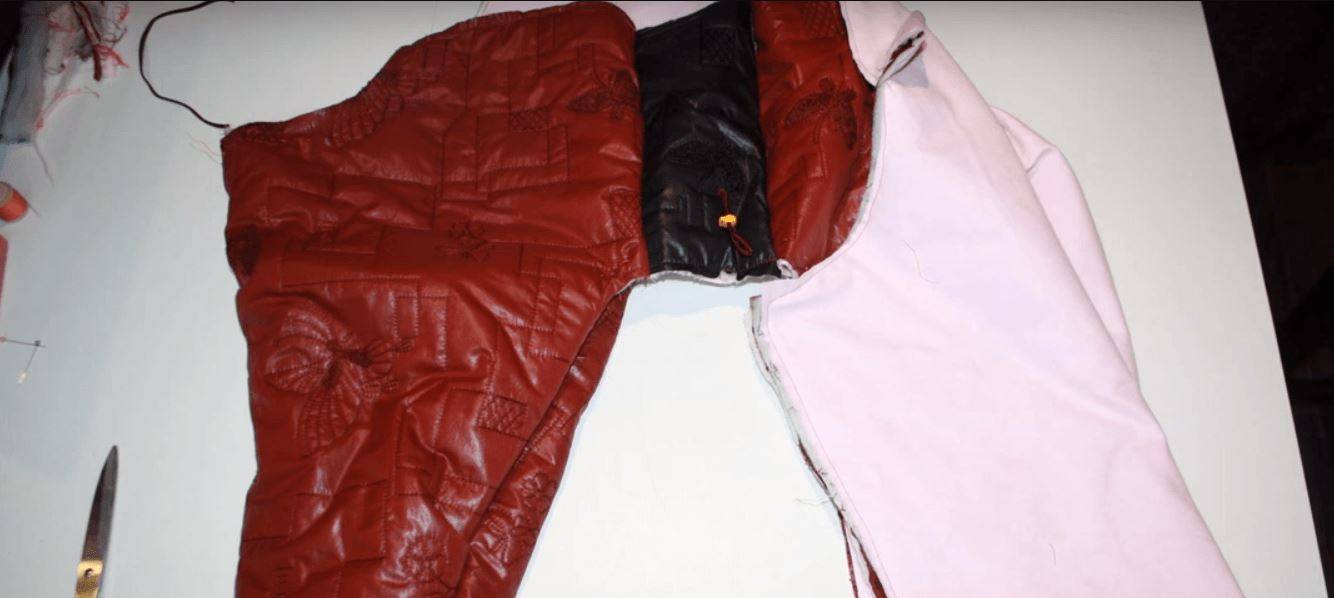 Для верности желательно изначально сметать изделие вручную, чтобы примерить его на питомца. Приступать к шитью нужно с боковушек. Первыми сшиваются вместе штанины. Вытачкам на спине закладывают по центру, прострачивают вдоль и поперек для прочности (длина вытачки 7 см). Дальше соединяем боковушки путем пришивания нижней вставки, которая закрывает живот и грудь.