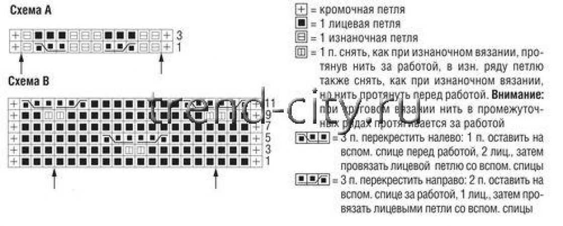 Вязать по схеме А рядами в прямом и обратном направлениях. В лицевых рядах считывать схему справа налево. В необозначенных на схеме изнаночных рядах петли провязывать по рисунку. После кромочной повторять 12 п. раппорта между стрелками, заканчивать кромочной.