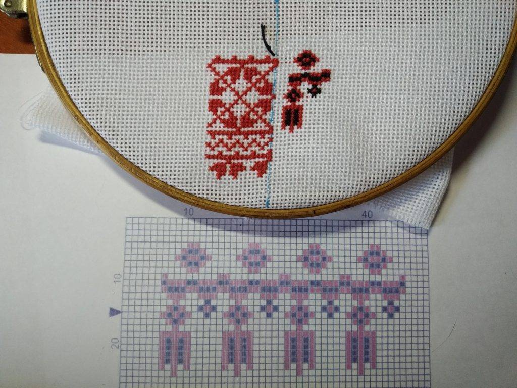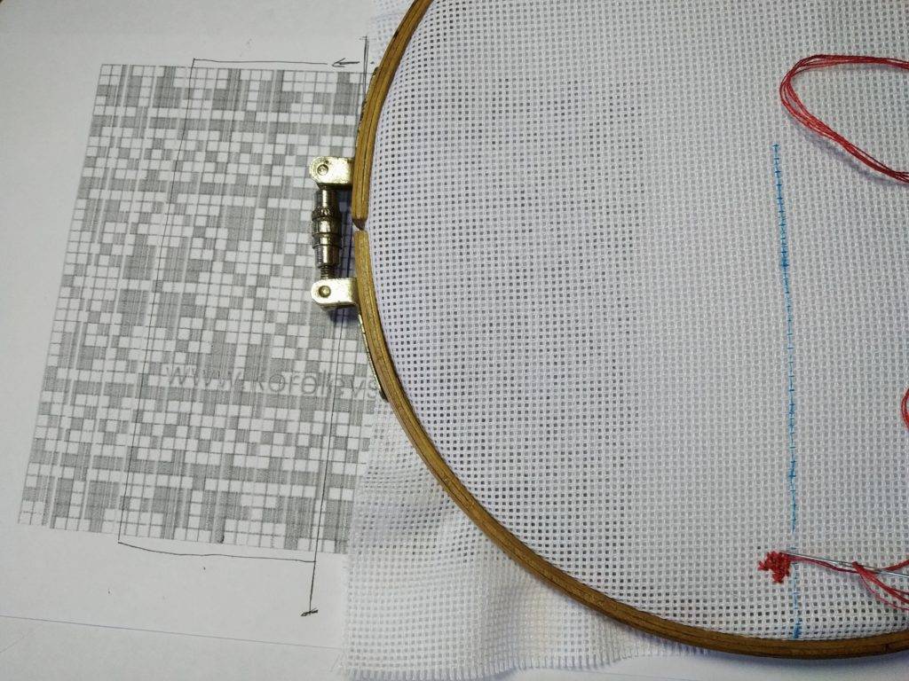 Вышивка рушника начинается с середины полотна. Узор должен быть симметричным, поэтому прочерчиваю центральную линию на схеме и канве.