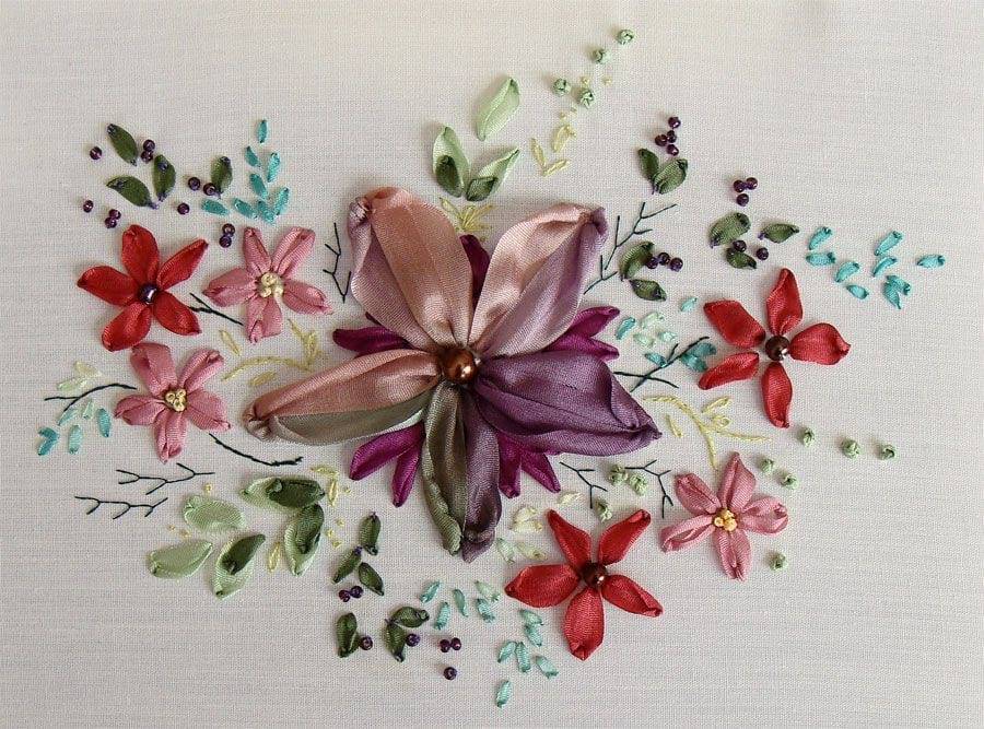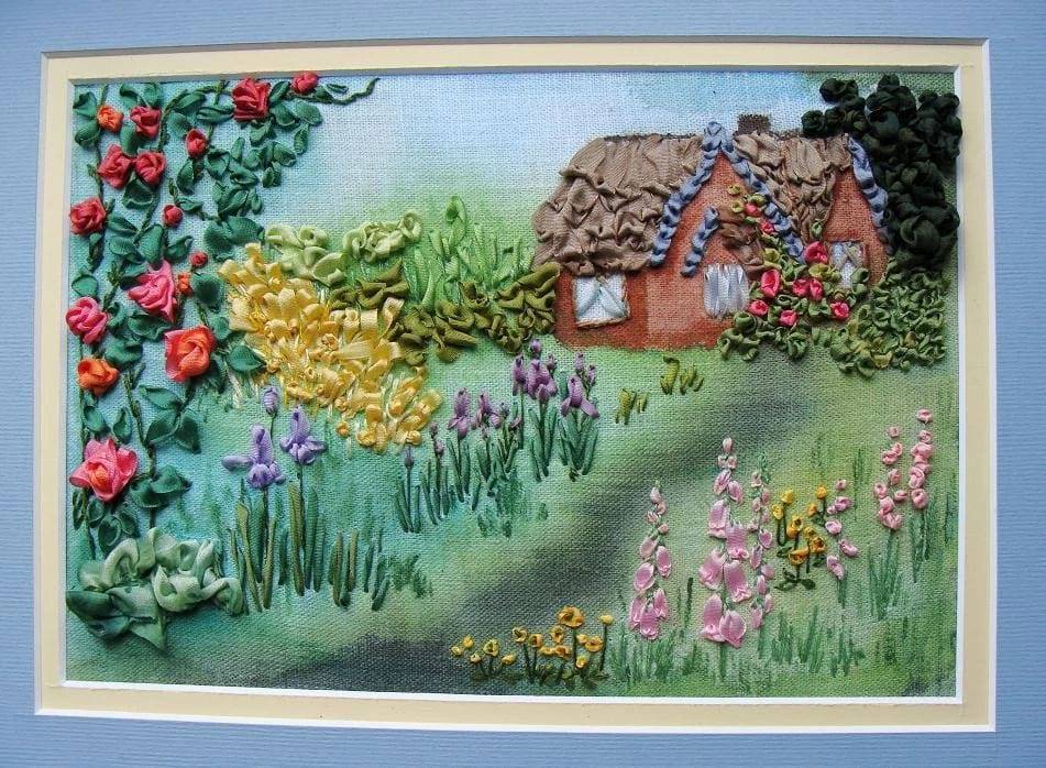После чего приступают к стежкам. В ленточной вышивке существует большой выбор разных стежков, поэтому не стоит ограничивать себя одним видом стежка в своей работе, так как только благодаря сочетанием нескольких видов картина получается эффектной и оригинальной. вышивка лентами