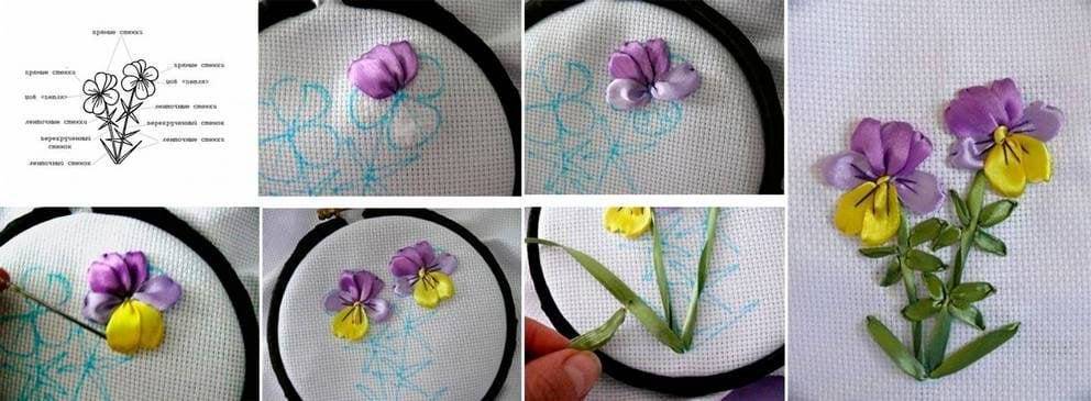 Красиво и просто получаются из ленточек анютины глазки, которые никогда не завянут.