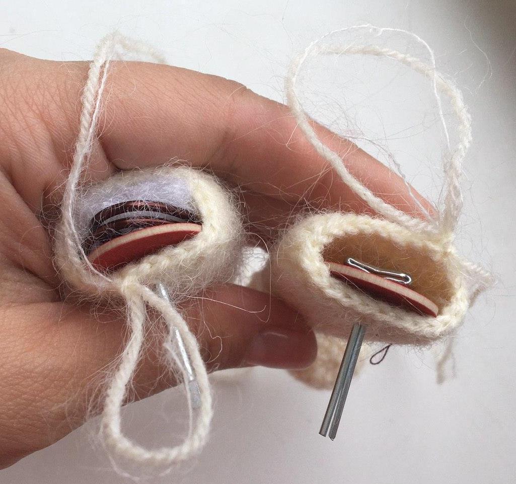 - У основания выпирающей части мордочки из акрила крепятся глаза. Лучше приобрести готовые детали, которые используют при изготовлении многих игрушек.