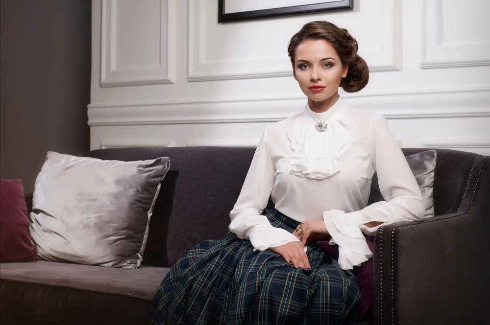 - высокая аккуратная прическа и маленькие серьги, пуссеты или тонкие подвески, сделают образ с жабо еще более утонченным и возвышенным;