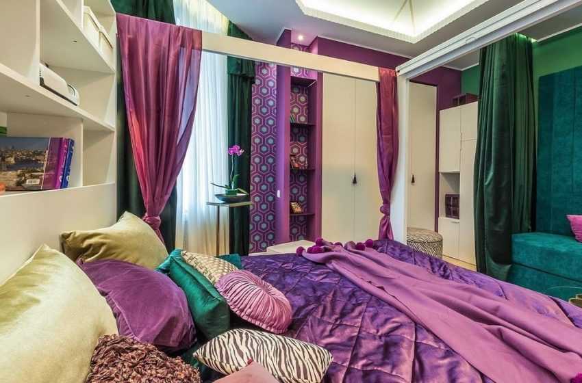 Фиолетовая спальня с добавлением зеленого – такое сочетание, несмотря на свою необычность, смотрится очень выигрышно. Зеленый цвет символизирует духовное возрождение, вдохновение. Он обязательно добавит в спальню нотки свежести.