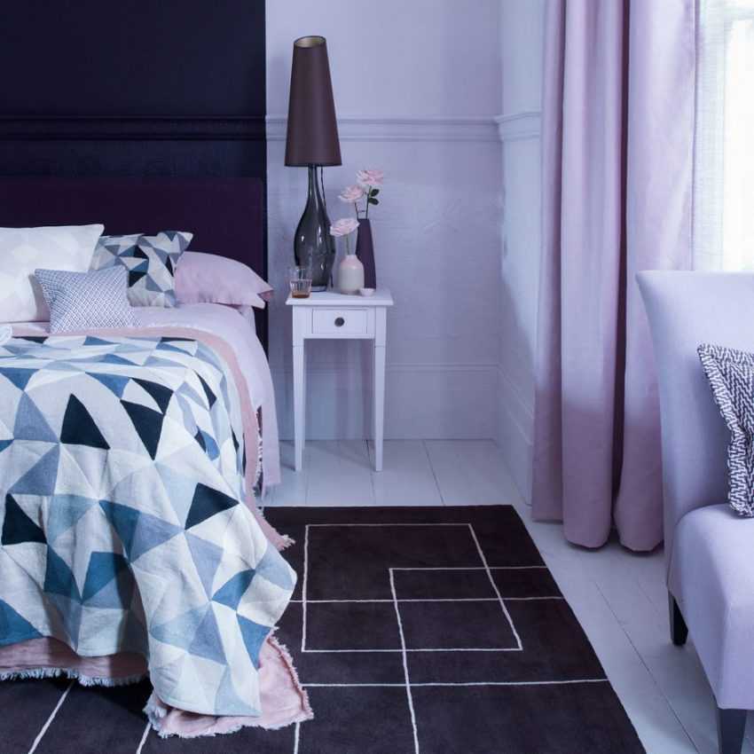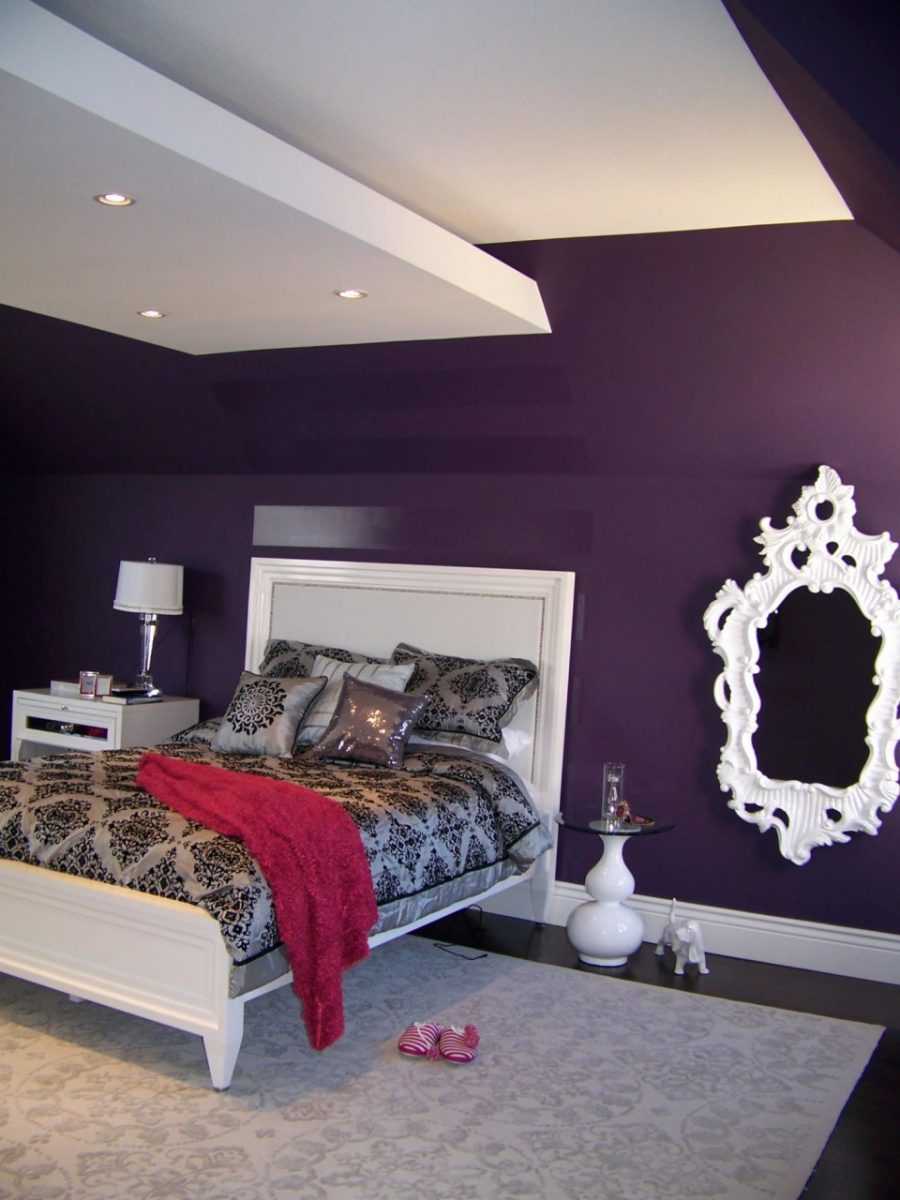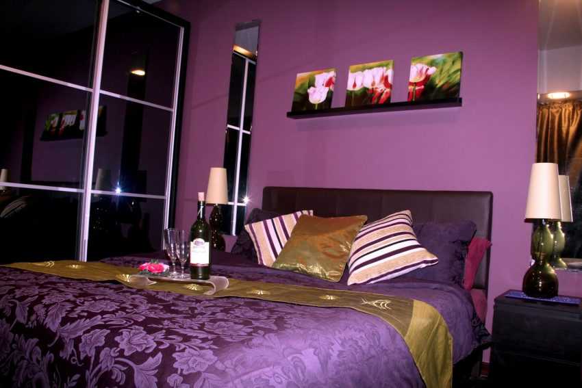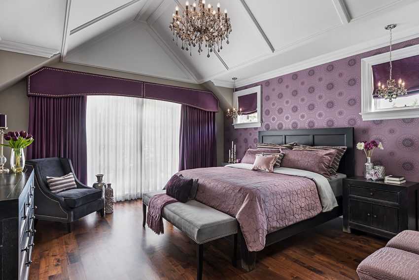 Фиолетовый интерьер в спальне имеет массу вариантов сочетаний. Попробуем рассмотреть наиболее распространенные: