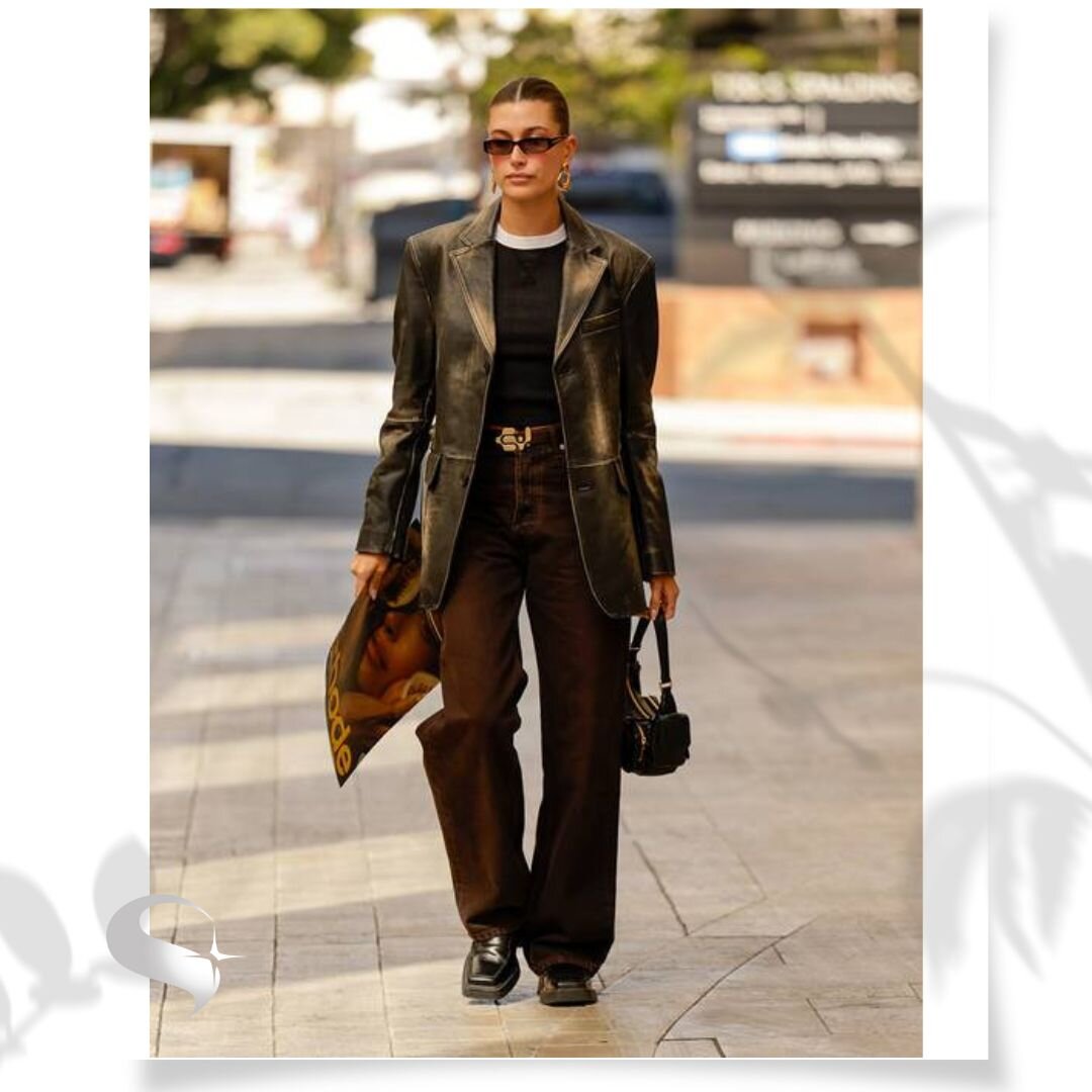 Примечание к стилю: Сочетание джинсов, кожаной куртки и лоферов от Хейли Бибер как раз в стиле 2023 года.