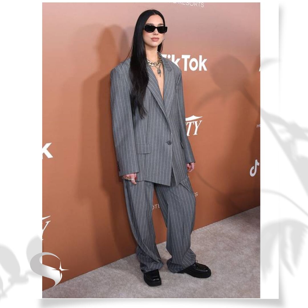 Примечание к стилю: Брючный костюм с широкими брюками смотрится очень круто с лоферами. Отличная игра, Дуа.