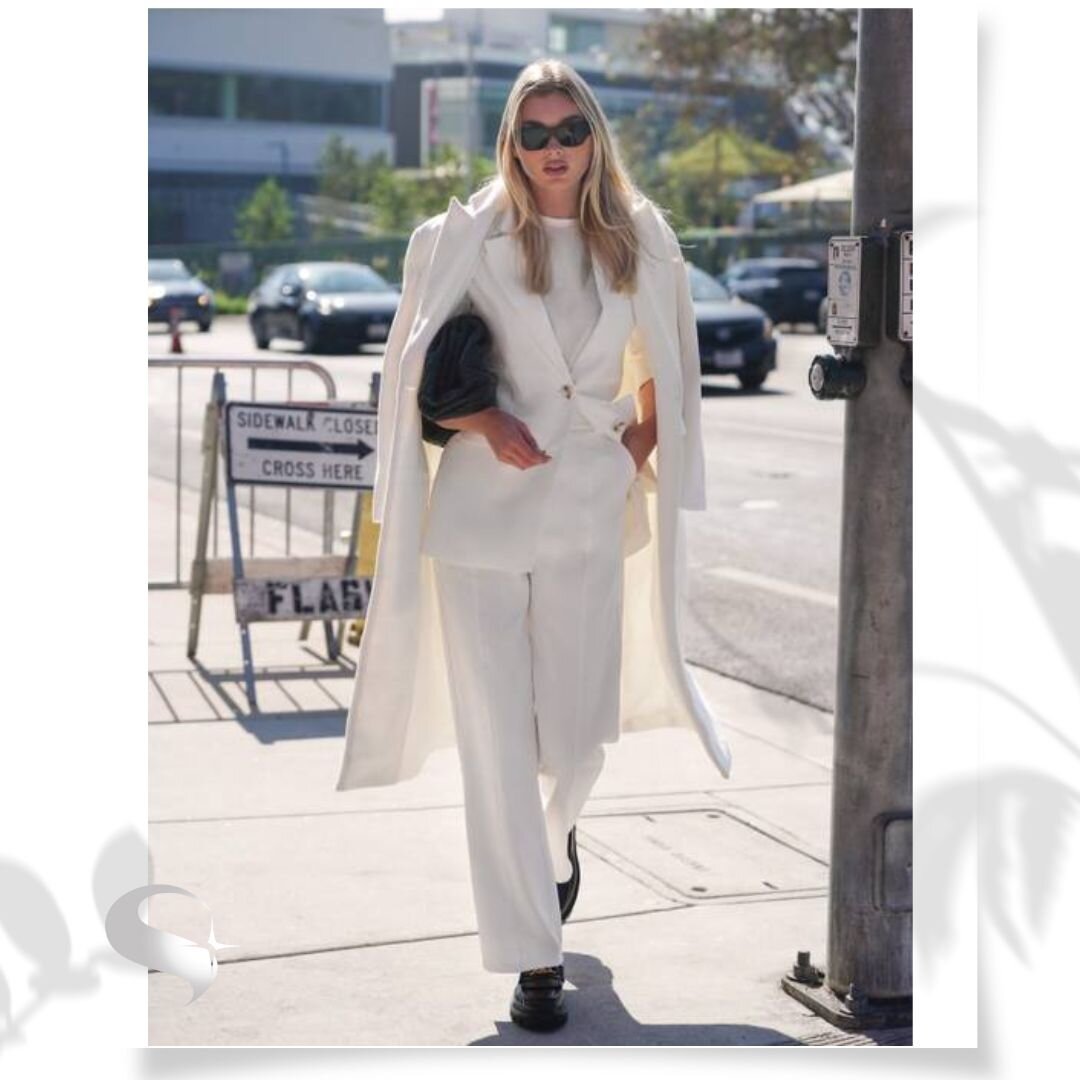 Примечание к стилю: Эльза Хоск сменила туфли на каблуках на лоферы на толстой подошве, чтобы придать изюминку своему элегантному белому костюму.