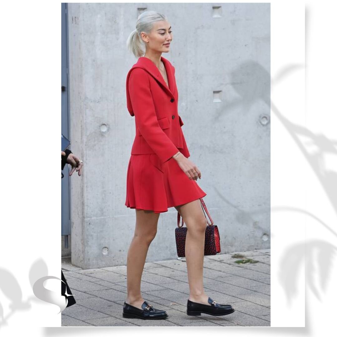 Примечание к стилю: Амалия Гассманн придает своему красному юбочному костюму изюминку с помощью черных лоферов.