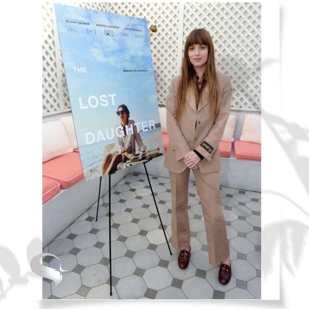 Примечание к стилю: Дакота Джонсон обычно носит лоферы Gucci, и нам нравится, как эта темно-бордовая модель смотрится с ее костюмом цвета кэмел.